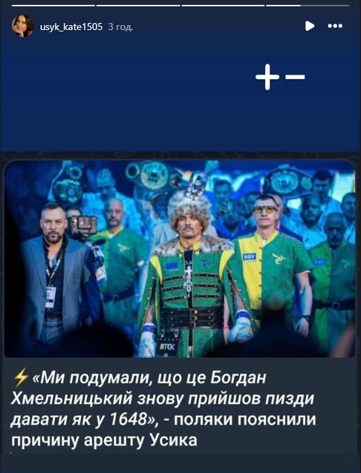 Шутку про сходство боксера с Богданом Хмельницким она опубликовала у себя в историях на странице в Инстаграмме.