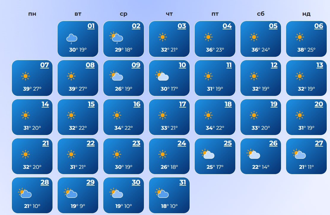 В Харькове лишь в начале месяца возможны дожди. Практически весь август ожидается ясная погода и жара. Температура будет колываться от +9°С до +38 °С.
