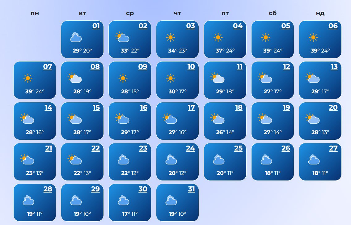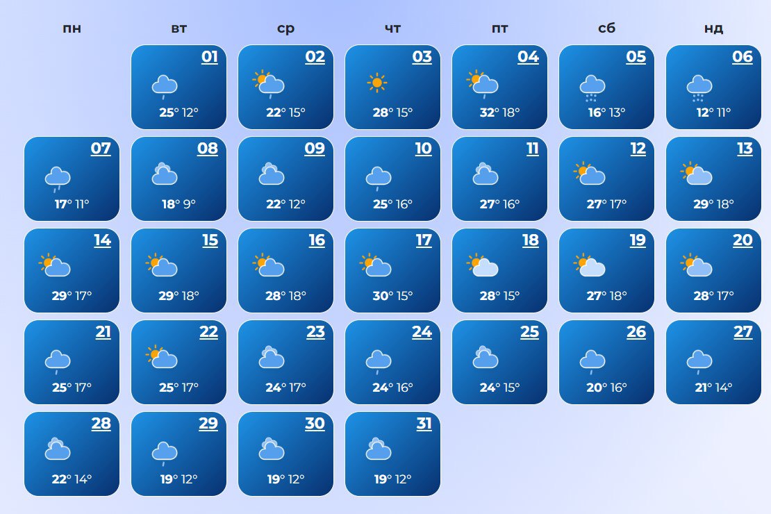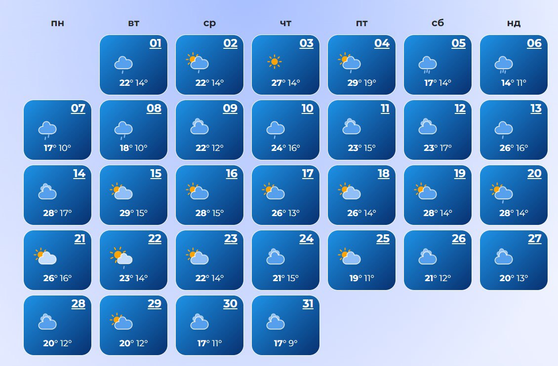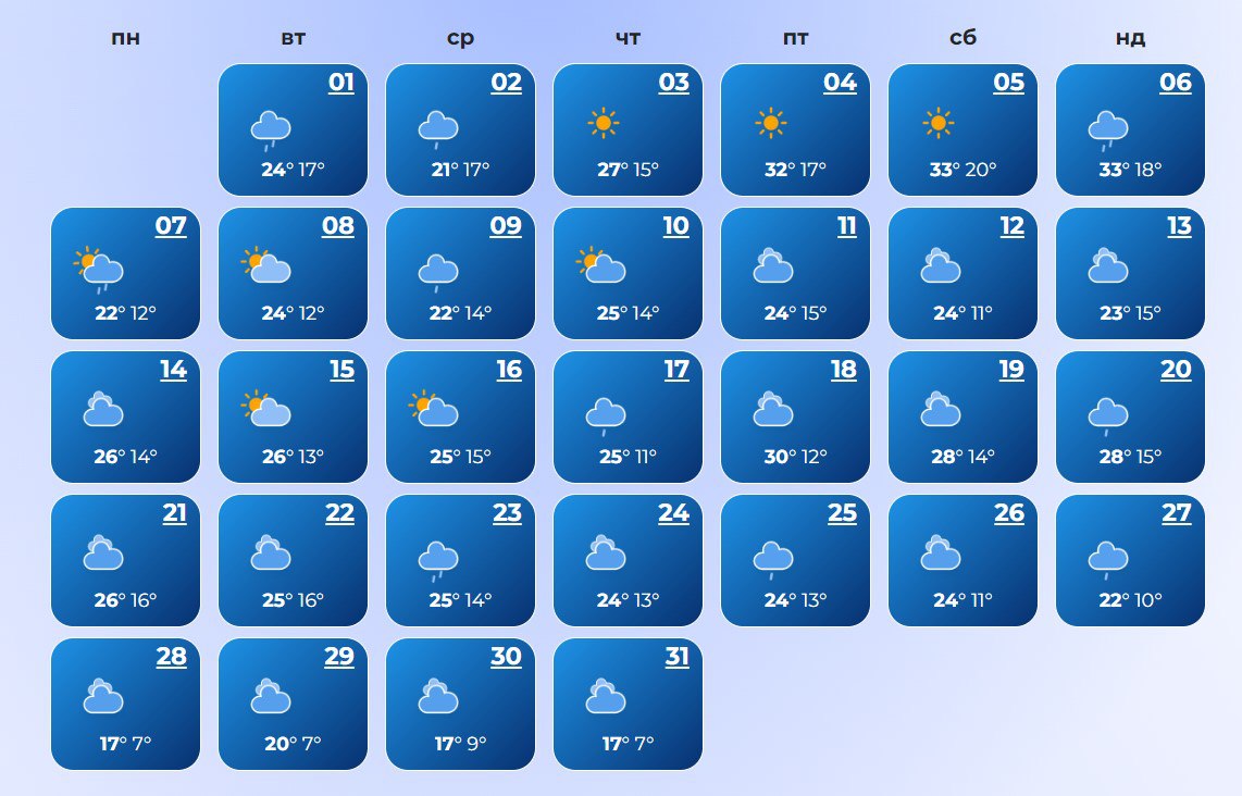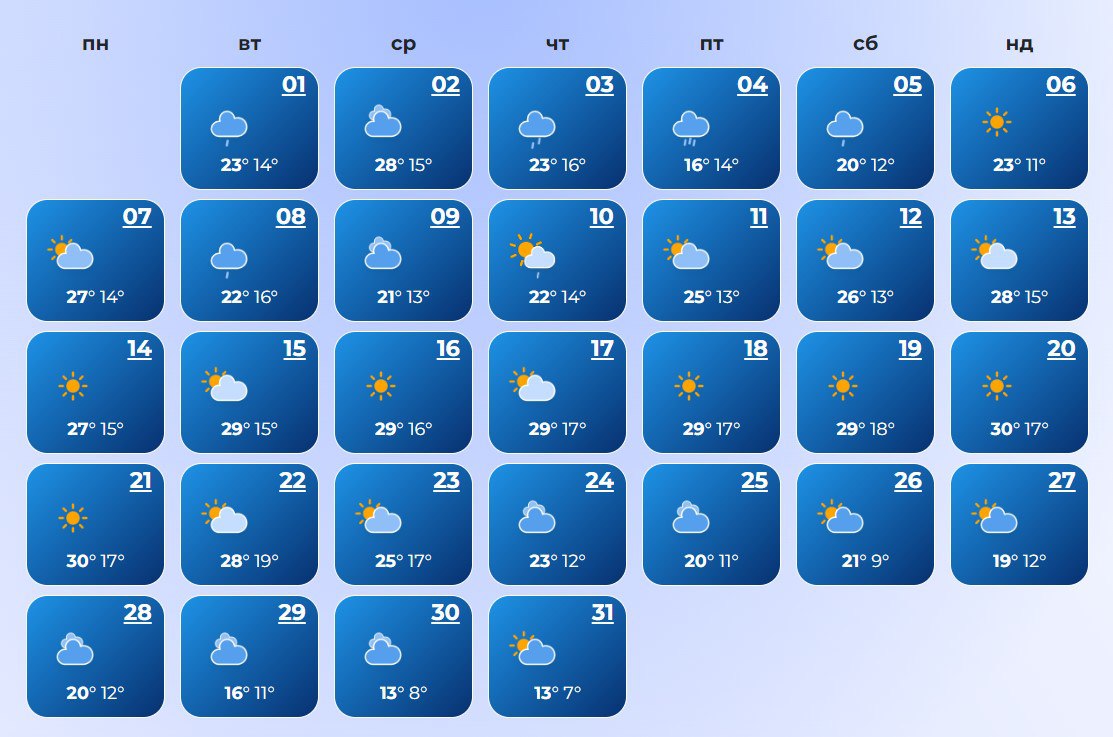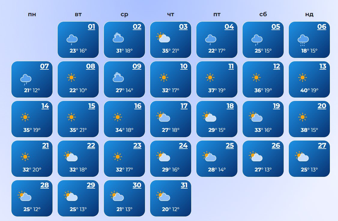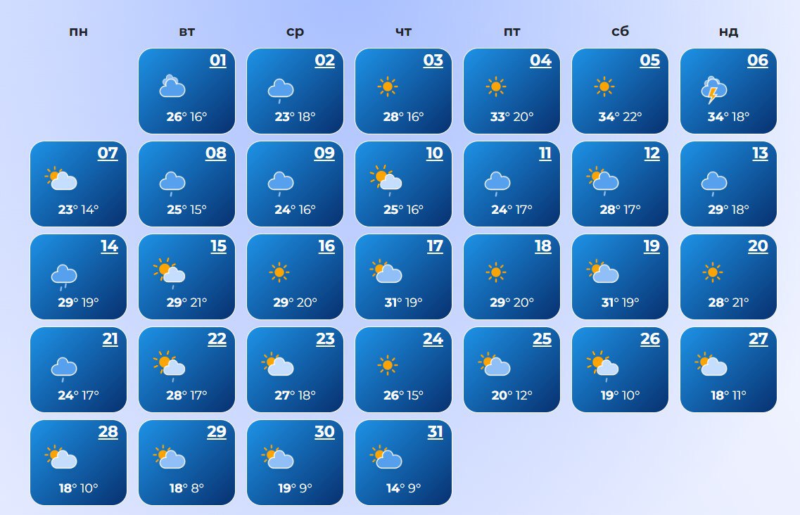 В Луцке ожидается холодная погода в течение всего месяца. Температура воздуха ночью +7°С, днем +30°С.