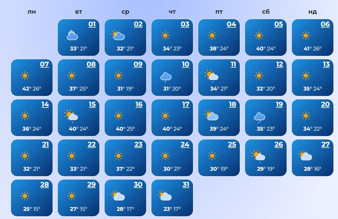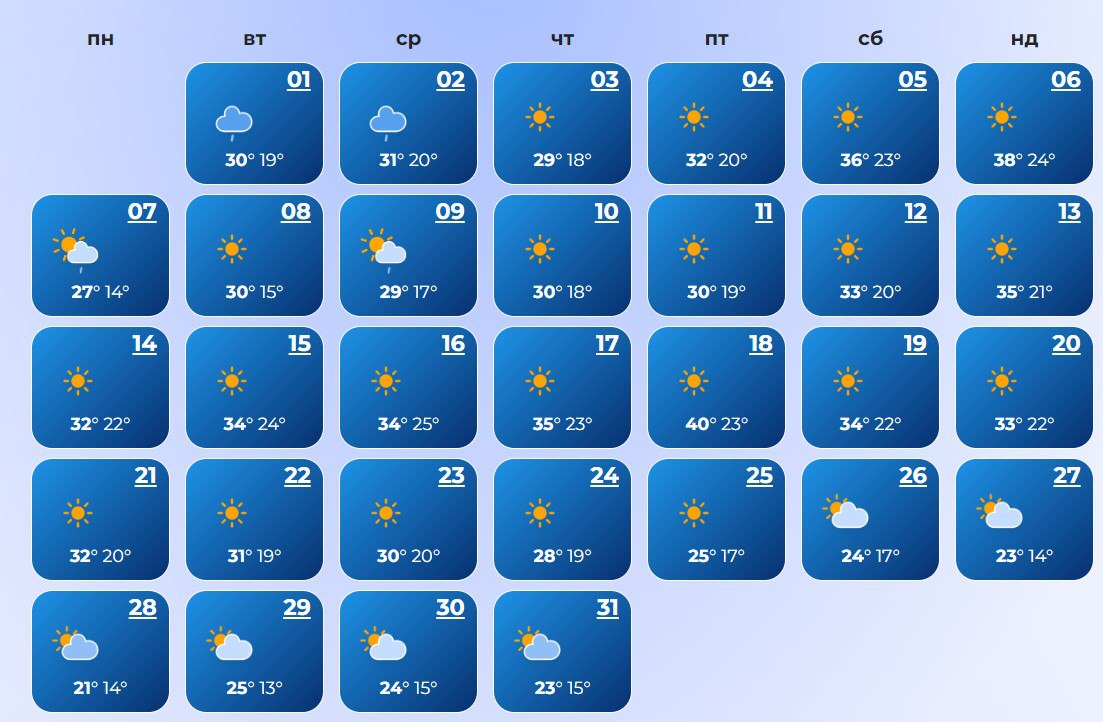В Запорожье в начале месяца пройдут дожди. В течение месяца температура воздуха будет от +17°С до +41°С днем.