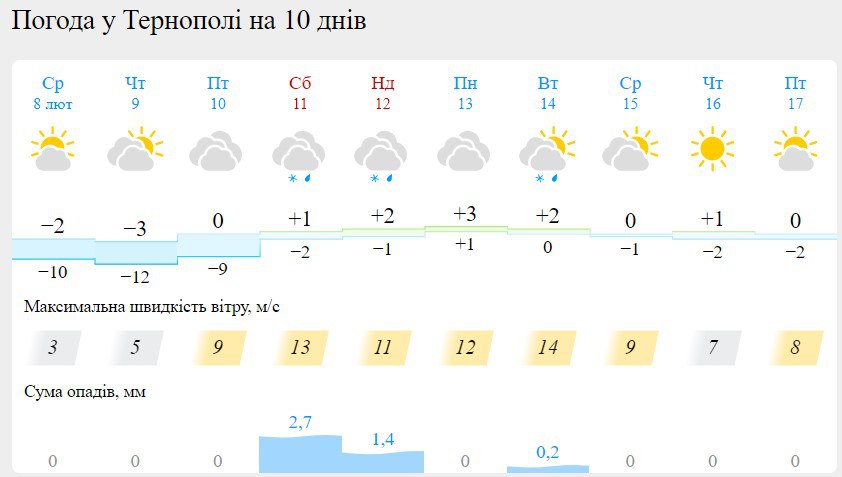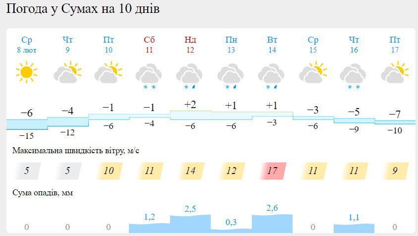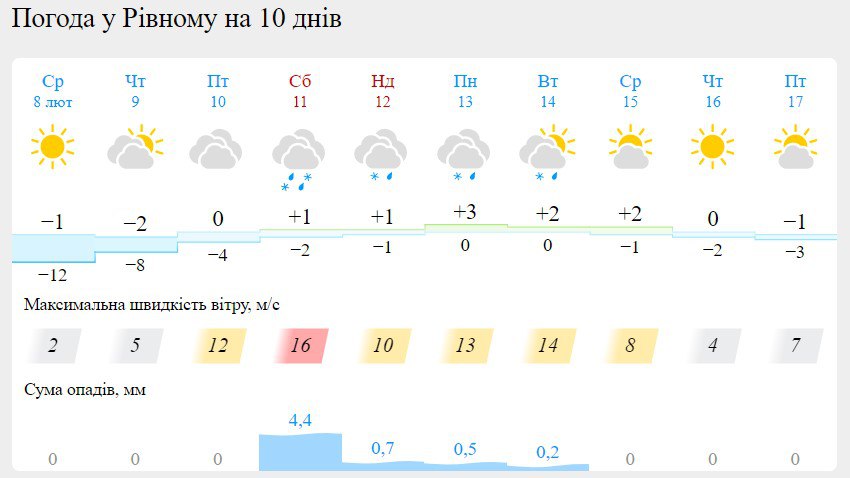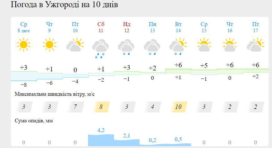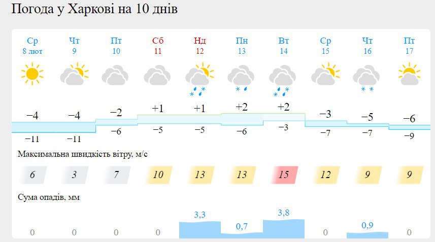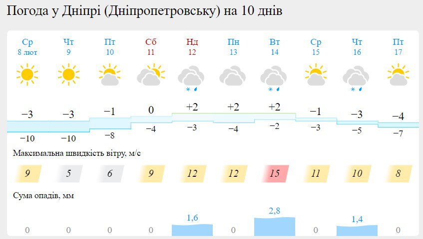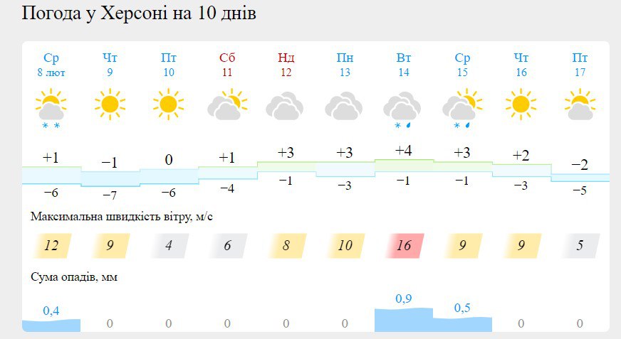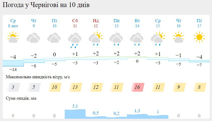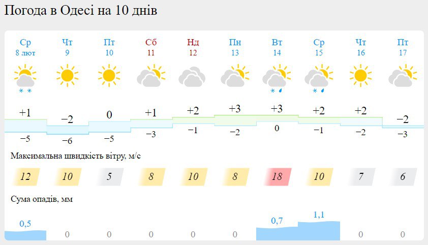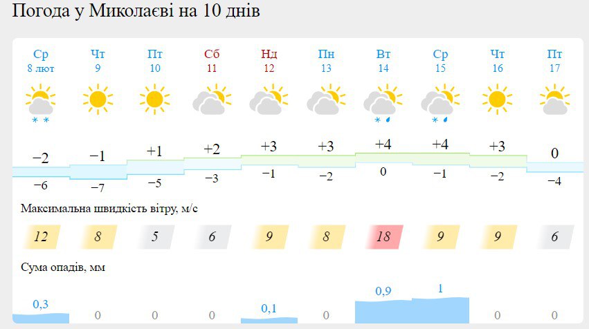 В частности, 9 февраля, когда Православная Церковь отмечает память святителя Иоанна Златоуста, ожидается солнечная погода практически во всех областях. Облачно будет только на севере и частично облачно в Киеве. Температура воздуха опустится ночью до -12°C, на западе и северо-востоке, на севере до -8°C, на юге до -6°C, на востоке до -11°C. Днем столбики термометров будут показывать минусовую температуру от -1 до -4°C.