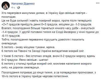 По словам метеоролога, похолодание продлится до конца недели, а по предварительным прогнозам, с 10-го февраля в Украину придет очередное потепление.
