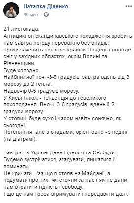 "Потепление, но с осадками, ориентировочно - с воскресенья (на диаграмме). Завтра - в Украине День Достоинства и Свободы. Будем встречаться, вспоминать, гордиться и поминать. Не кричать - "за что я стоял на Майдане", а подумать о тех , которые стояли за нас и которые не дали нам потерять достоинство и свободу. И что это нам нужно удерживать и передавать дальше", - написала Диденко.