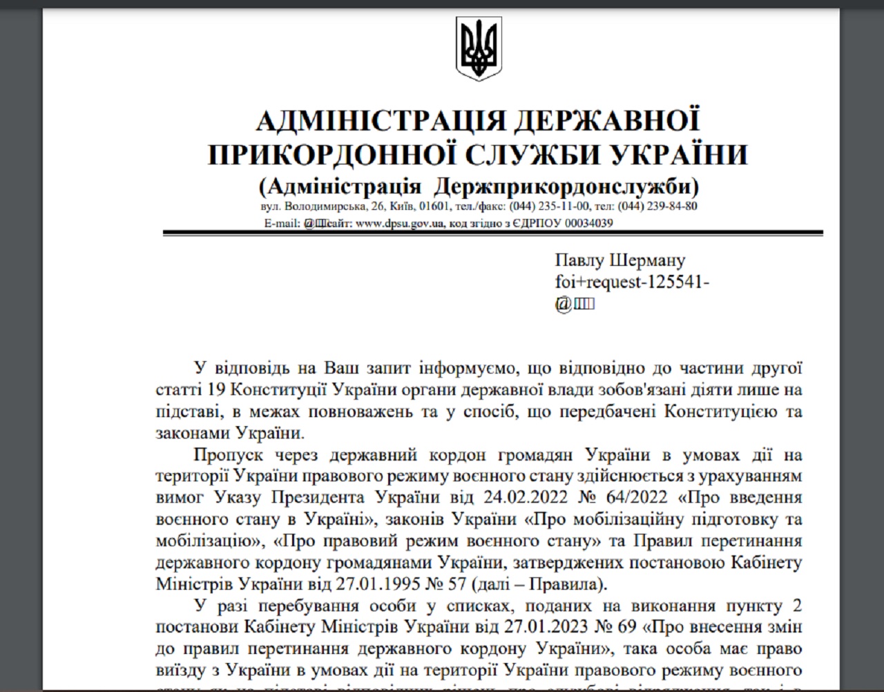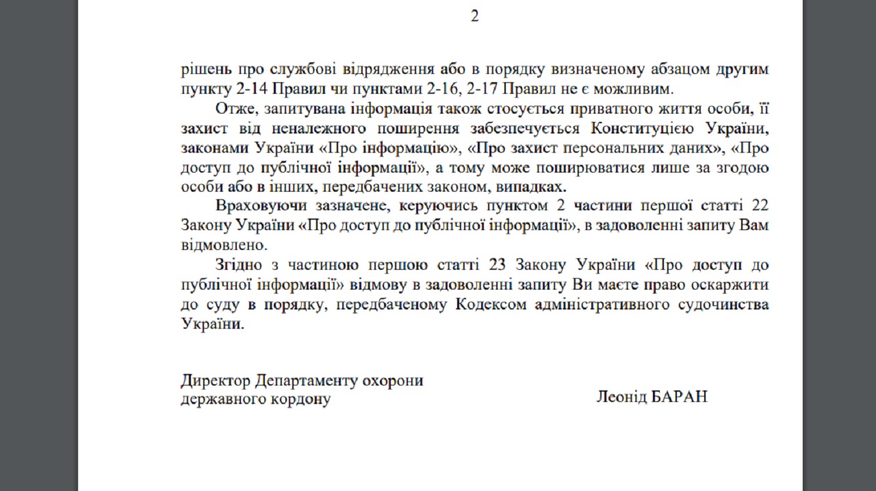 Государственная погранслужба это не опровергла, и прокомментировать детали "командировки" должностного лица отказалась: "Запрашиваемая информация касается частной жизни лица, его защита от ненадлежащего распространения обеспечивается Конституцией Украины, законами Украины "Об информации", "О защите персональных данных", "О доступе к публичной информации", а потому может обнародоваться только с согласия лица или в других, предусмотренных законом, случаях. Учитывая указанное, руководствуясь п. 2 ч.1 ст. 22 Закона Украины "О доступе к публичной информации", в удовлетворении запроса Вам отказано", – заявили пограничники.
