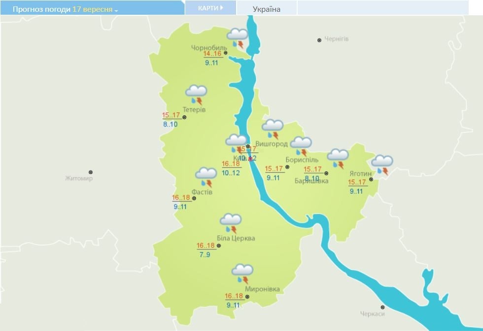 В Киеве 17 сентября также прогнозируют в течение суток ливни и грозы. Температура воздуха днем снизится до +16…+18 градусов. Ночью опустится до +10...12°C.