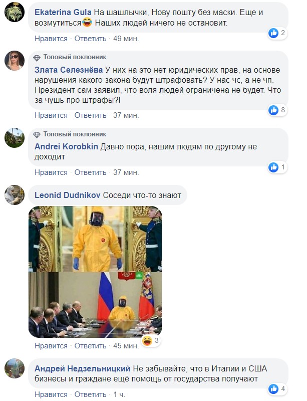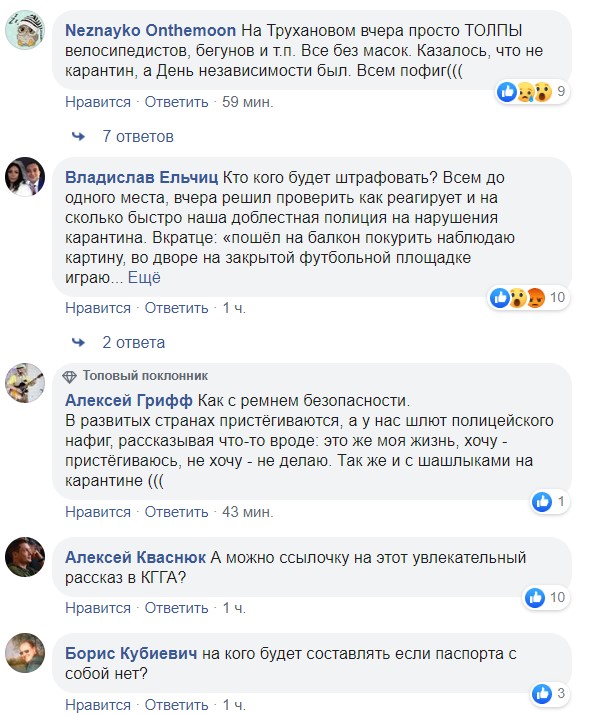 "У них на это нет юридических прав, на основе нарушения какого закона будут штрафовать? У нас чс, а не чп. Президент сам заявил, что воля людей ограничена не будет. Что за чушь про штрафы?!", "Имхо, если сабантуй у людей, проживающих в одной квартире, в лес они выехали на Ашане, рядом никого нет и у них мангал, а не костер - какая разница? Или птичек в лесу позаражают", "Уже давно пора штрафовать, иначе мы еще долго будем сидеть на карантине и падать в кризис", "На Трухановом вчера просто толпы велосипедистов, бегунов и т.п. Все без масок. Казалось, что не карантин, а День независимости был", - пишут в комментариях.