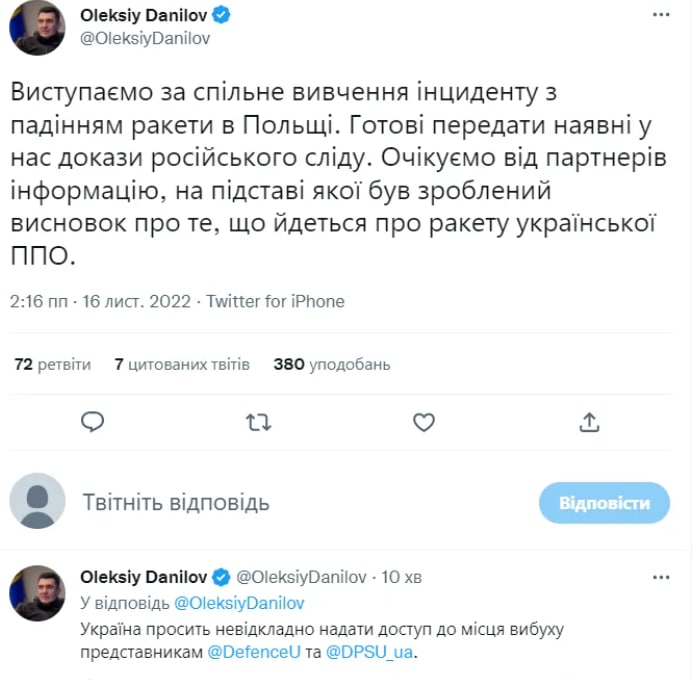 "Выступаем за совместное изучение инцидента с падением ракеты в Польше. Готовы передать имеющиеся у нас доказательства российского следа. Ожидаем от партнеров информацию, на основании которой был сделан вывод о том, что речь идет о ракете украинского ПВО. Украина просит немедленно предоставить доступ к месту взрыва представителям Минобороны и Госпогранслужбы", – написал Данилов.