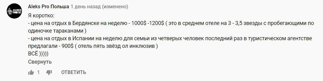 Блогер сравнил цены Бердянска и цены на одном из курортов в Испании. По его словам, на неделю на испанском курорте можно было купить путевку за 900 долларов и это за четверых человек в отеле 5 звезд.