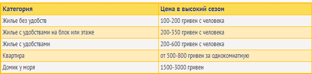 Цены колеблются от 100-200 гривен на человека в доме без удобств до аренды однокомнатной квартиры за 500-800 гривен в сутки. Арендовать домик у моря можно за 1,5 - 3 тысячи гривен в сутки.