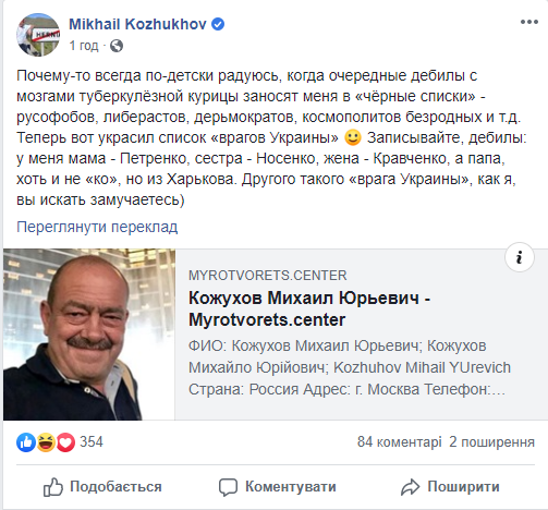 В соцсети не понимают возмущения Михаила Кожухова по поводу внесения его в список "Миротворца".