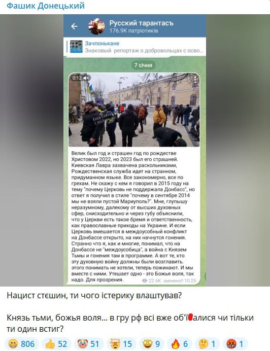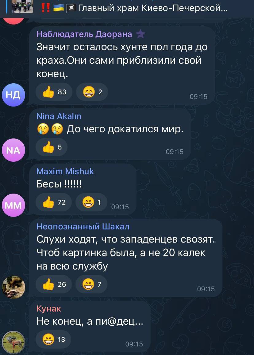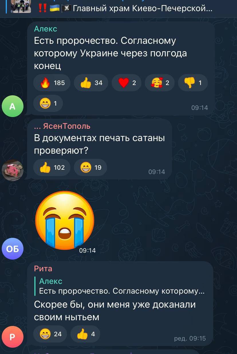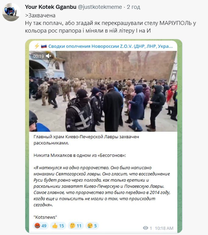 Многие упоминают некое "пророчество монахов Святогорской лавры", один из скитов которой уничтожили россияне, о котором рассказывал один из самых ревностных российских пропагандистов, режиссер Никита Михалков. Там сказано, что "воссоединение Руси будет ровно через полгода, как еретики и раскольники захватят Киево-Печерскую и Почаевскую Лавры". Россияне уже начали считать дни и призывают "объявлять на СВО, а крестовый поход".