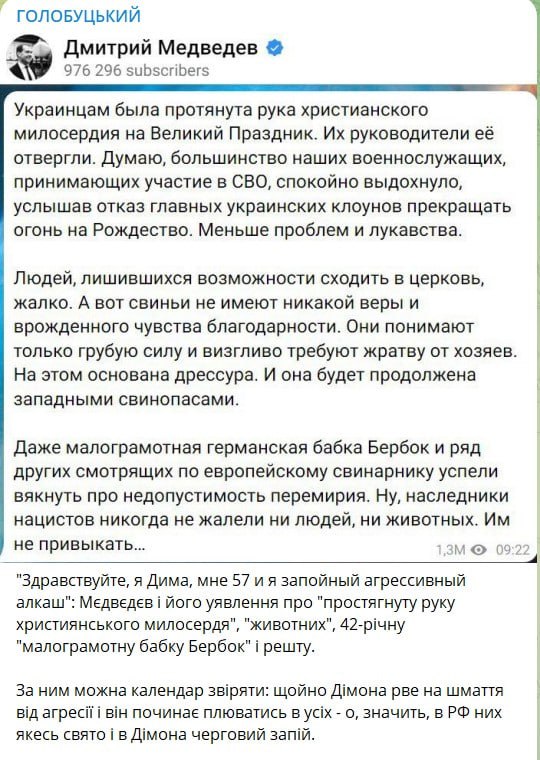 Официальные лица России, например бывший российский президент, а в настоящее время заместитель председателя Совета Безопасности РФ и председатель партии "Единая Россия" Дмитрий Медведев, подогревают истерию и пытаются протолкнуть в сознание масс идею "священной" войны. Медведев лицемерно жалеет "людей, лишившихся возможности сходить в церковь" и упоминает, что "свиньи не имеют никакой веры и врожденного чувства благодарности".