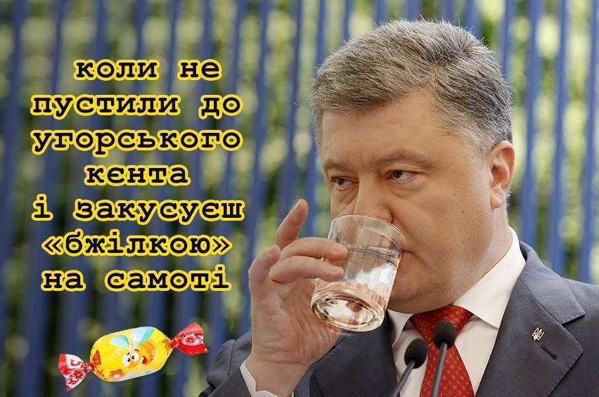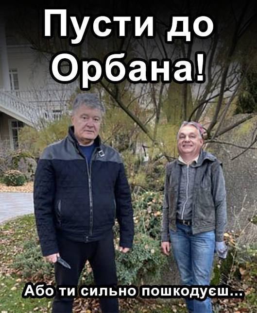 "Пусти к Орбану, иначе сильно пожалеешь", - сказано в подписи к фотожабе, на которой Порошенко стоит с ножом в руках.