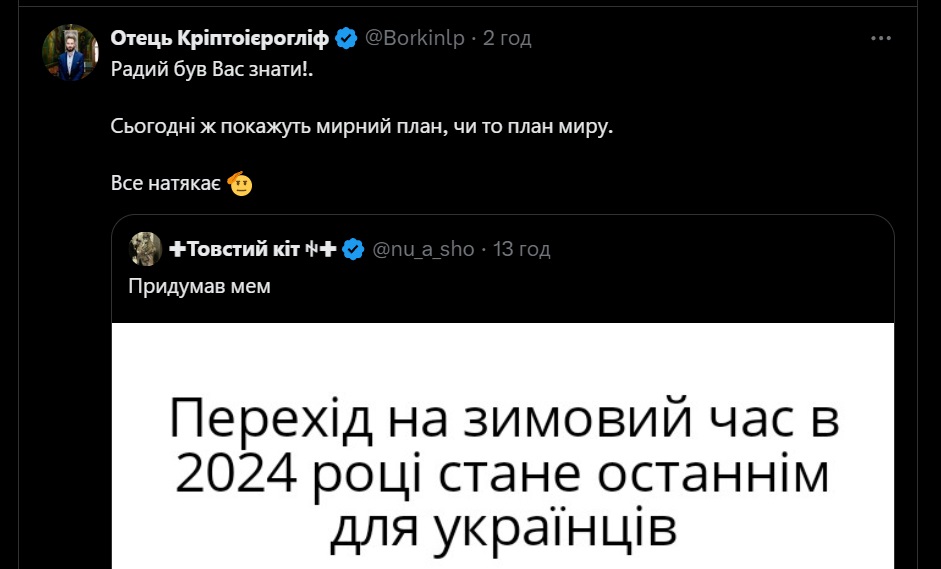 В меме указывается на двойной смысл высказывания: что больше не придется переводить часы и вместе с тем, что перевод часов может быть последним в целом, ведь в стране война и существуют прямые угрозы жизни.