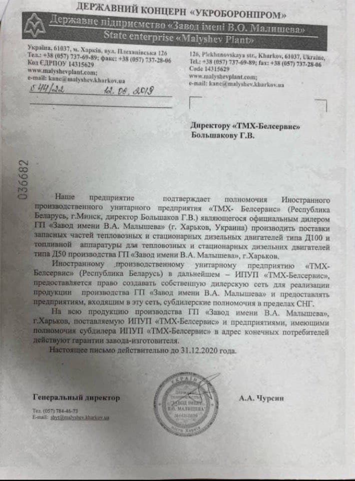 Как говорится в материале, Чурсин, "зная о конечных бенефициарах компании ИПУП "ТМХ-Белсервис", а также о том, что компания-бенефициар находится в санкционном списке, нарушал Указ Президента Украины и решение СНБО Украины и предоставил ИПУП "ТМХ-Белсервис" дилерские полномочия на территории стран СНГ на поставку запасных частей для тепловозных и стационарных дизельных двигателей типа Д100 и Д50 производства ГП "Завод имени В.А. Малышева", которые являются критическим импортом для нужд ОАО РЖД и АО концерна "Росэнергоатом".