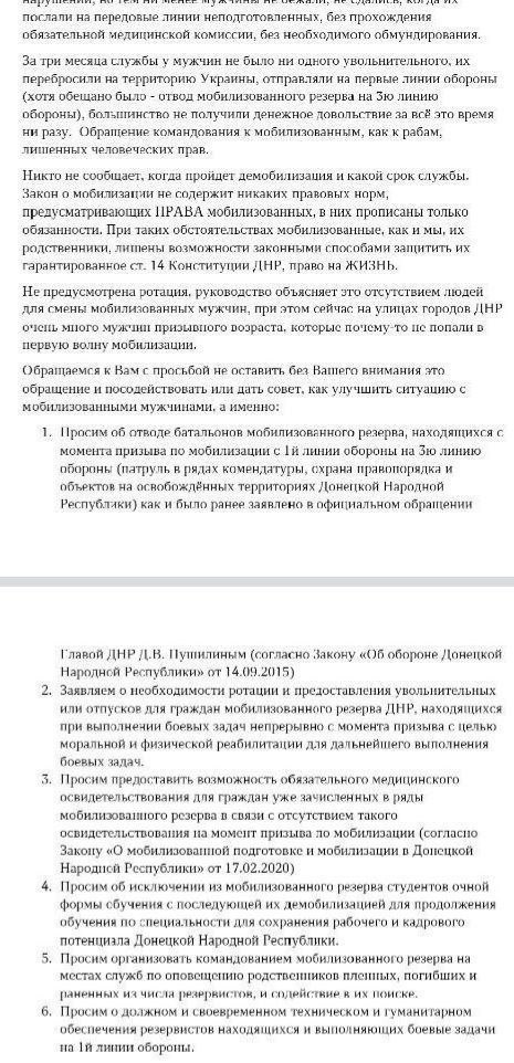 В обращении отмечается, что несмотря на нарушения прав мобилизованных, мужчины не отказались воевать и не сбежали после того, как их отправили на первые линии обороны, вместо третьих. Также говорится о том, что за три месяца войны с Украиной, у них не было ни одного увольнительного, а большинство не получили денежное довольствие за все это время. Также акцентируется отношение к военнослужащим - "как к рабам, лишенных человеческих прав".