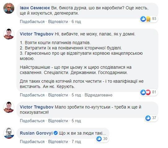 "Это требуется особый талант так исказить здание", "Ребята, это не капитальный ремонт или реконструкция - это рагулизм. Во всем цивилизованном мире исторические здания пытаются оставлять историческими, а вы взяли и сделали исторического здания какое-то чучело цвета детской неожиданности... Ну вот что вы за люди такие", "Здание 1848 построения. Пережило 2 мировые войны... ", "Вандализм! вы еще этим гордитесь? Такой красивый балкон разрушили.. Вас нельзя допускать к реконструкции", - пишут они.