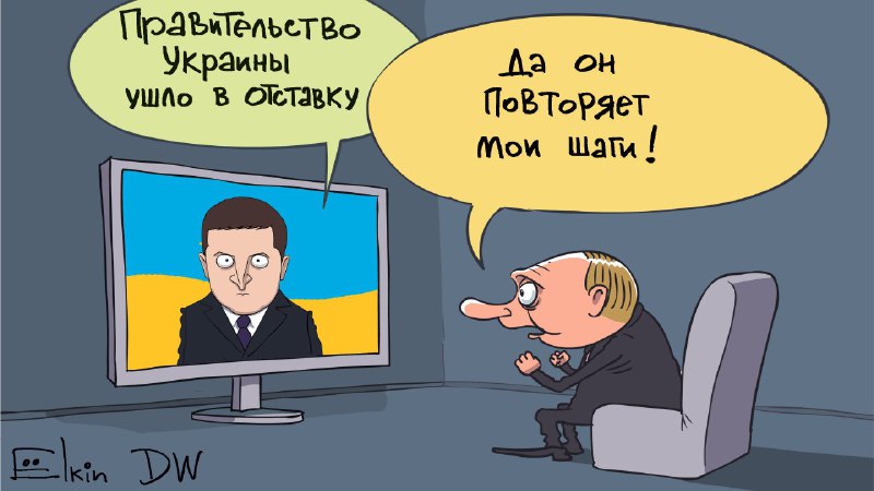 На рисунке он изобразил президента РФ Владимира Путина, который якобы смотрит телевизор. В это время по ТВ показывают украинские новости, где глава Украины Владимир Зеленский сообщает, что правительство страны ушло в отставку.