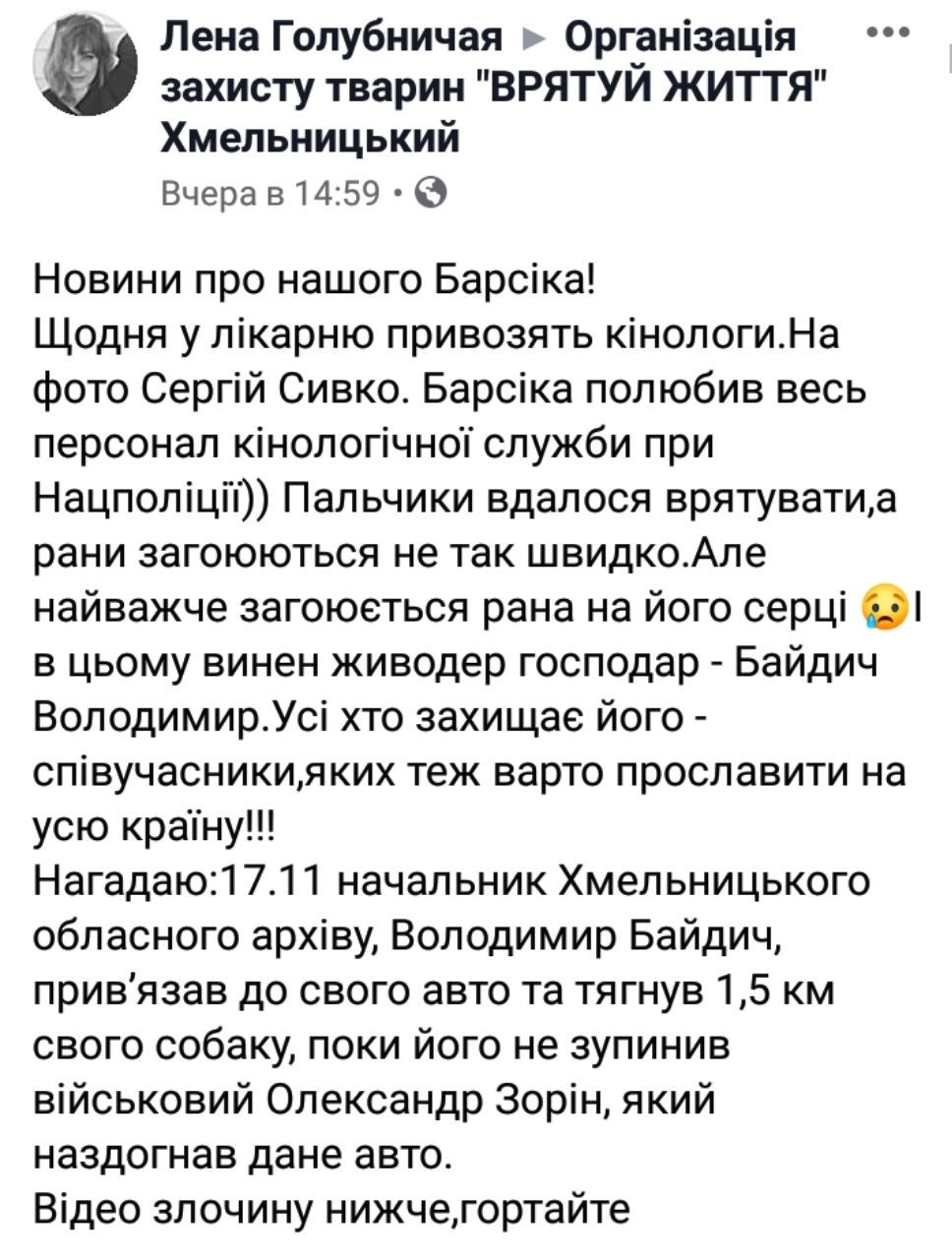 "Апостроф" отслеживает судьбу собаки. Ранее писал о том, что сети обнародовали новое видео страшной расправы директора государственного архива Хмельницкой области Владимира Байдича над собакой. Мужчина привязал животное к автомобилю и тащил по дороге, пока его не остановил военный Александр Зорин.