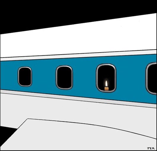 Так, на одной из работ автор выразил с помощью рисунка внешней части авиационного борта со свечкой в салоне траур по жертвам трагедии.