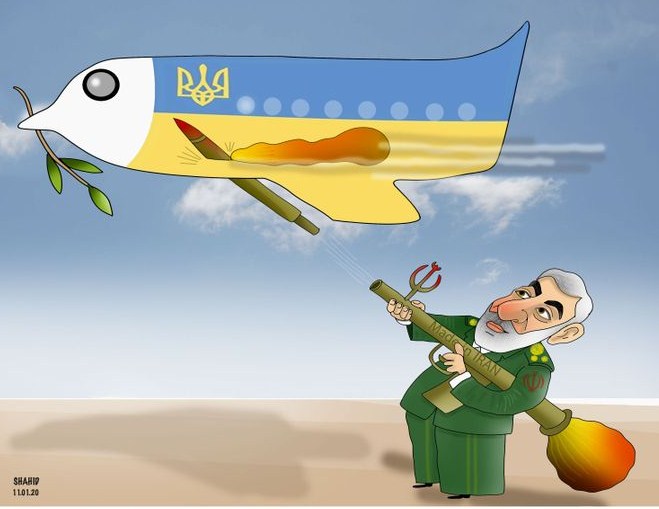 Другой рисунок представляет собой иллюстрацию признания иранских вооруженных сил, что именно они сбили самолет, когда система ПВО перепутала его с ракетой. На этой карикатуре изображен иранский генерал с пусковой установкой, который направляет ракету в мирный украинский самолет.