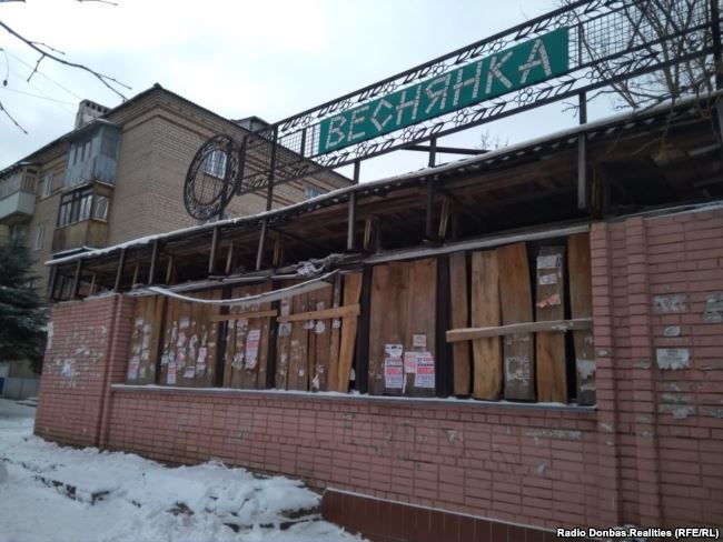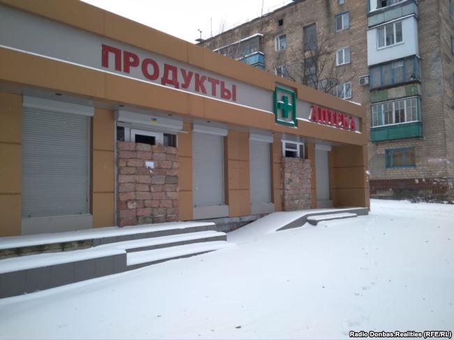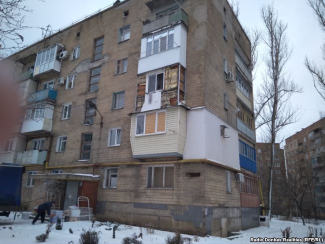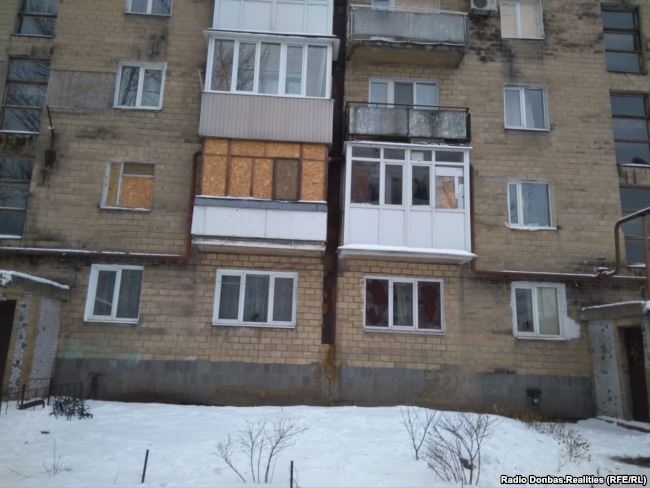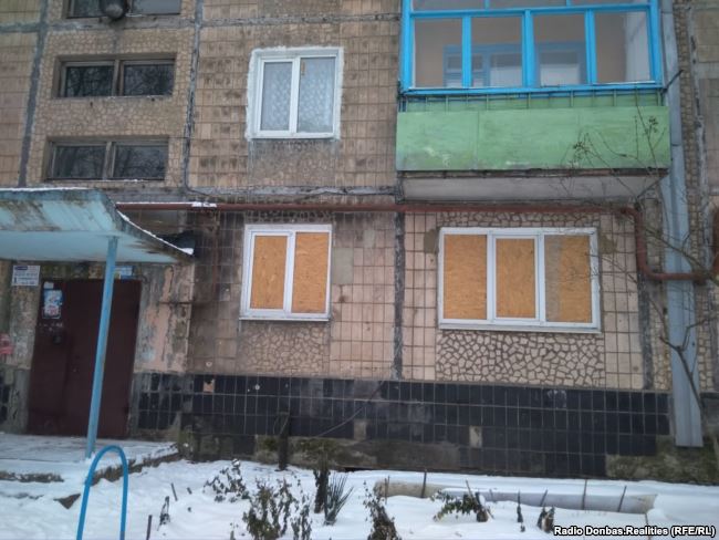 В некоторых жилых домах часть окон еще с 2014-2015 годов забиты фанерой. Встречаются также нежилые здания, где разрушенные двери просто заложили кирпичом.
