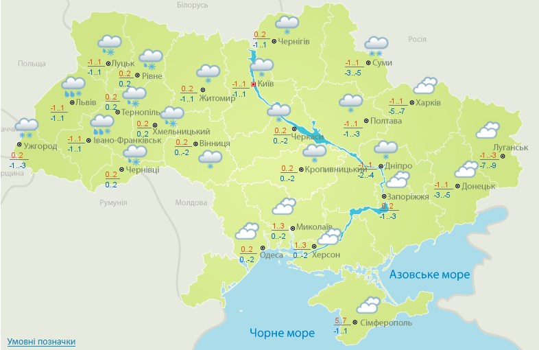 Температура днем будет от –3 градусов на Востоке до +3 на Юге. В оккупированном Крыму будет от 5 до 7 тепла.