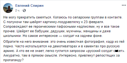 Обратите на него внимание: это очень известная фотография, кадр из гей порно. Часто используется на демотиваторах и в каментах про русскую армию. А кто ее не знает, легко гуглится запросом "русский солдат со*ет". Аккуратно, там в прямом смысле. Интересно, привлекут репостящих за пропаганду?", - написал он.