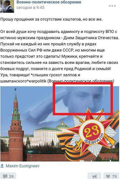"Не могу прекратить смеяться. Копаюсь по сепарским группам в контакте. С полуночи там шейрят картинку-поздравлялку к 23 февраля. Сопровождают ее героическими пафосными надписями, ну и все такое прочее. Шейрят ее бабушки, дедушки, мужчины, женщины и даже школьники. Но самое интересное – солдат на заднем фоне.