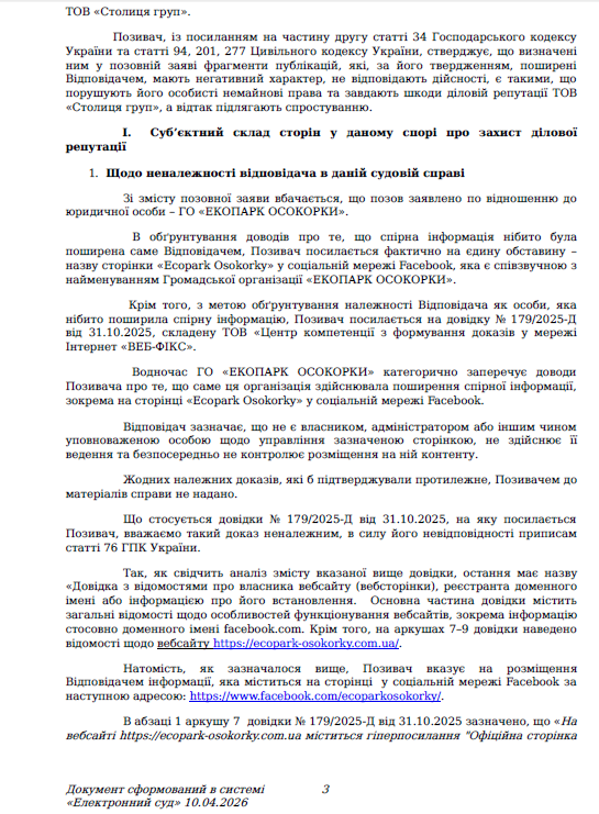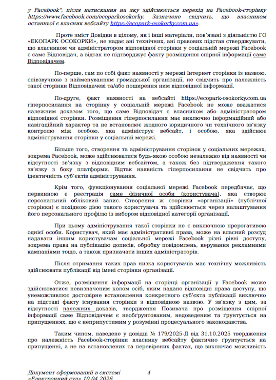 В своем отзыве ответчик отмечает, что не имеет отношения к странице Ecopark Osokorky в Facebook: организация отрицает статус владельца, администратора или любого лица, уполномоченного управлять этим ресурсом, а также отвергает контроль над публикациями.