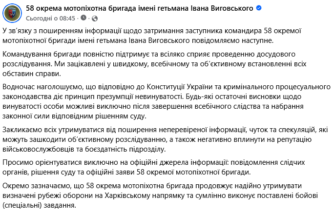 "Отдельно отмечаем, что 58 отдельная мотопехотная бригада продолжает надежно удерживать определенные рубежи обороны на Харьковском направлении и добросовестно выполняет поставленные боевые (специальные) задачи", — добавили в пресс-службе.