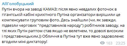 "Путин вчера на заводе КАМАЗ: после явно неудачных фоточок в гигантской кабине крошечного Путина организаторы решили это компенсировать групповым фото. Где-то нашли (или, как всегда, подвезли очередных "представителей народа") рабочих завода, на фоне которых Путин вдруг стал если не великаном, то довольно высоким и представительным. Лицо у Путина здесь уже явно довольное: угодили мини-диктатору", - обратил внимание Голобуцкий.