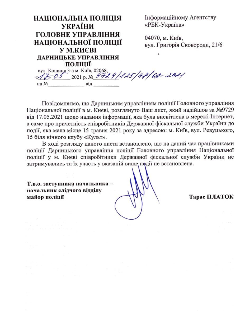 Дарницкое управление Национальной полиции города Киев опровергло информацию о том, что в массовой драке со стрельбой, состоявшейся 15 мая в ночном клубе "Культ" по улице Ревуцкого на Позняках, участвовали сотрудники и руководители Государственной фискальной службы.