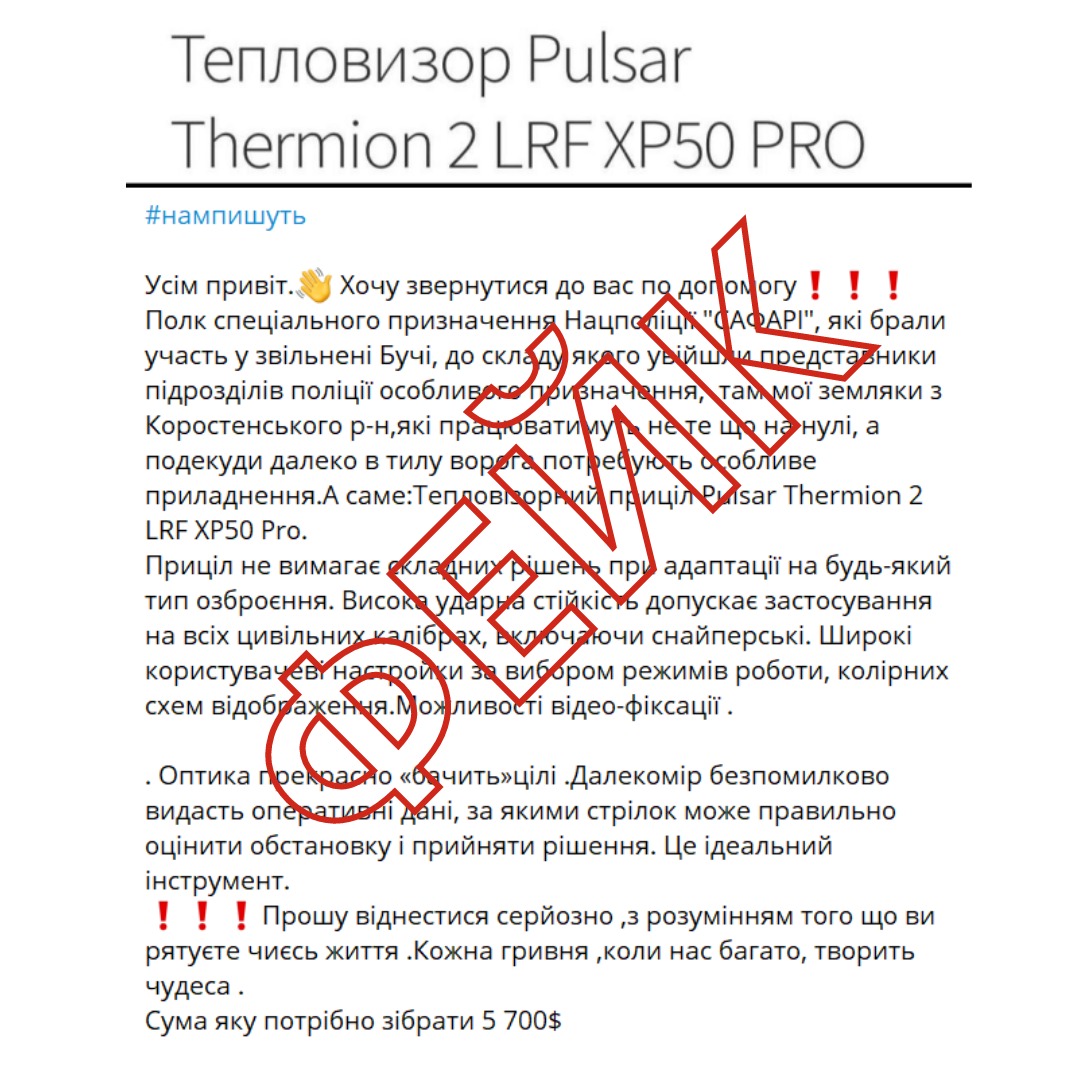 "На страницах соцсетей появились сообщения о сборе средств на военное оборудование, публикуемые якобы от представителей полка "САФАРИ". Отмечаем, что Полк спецназначения "Сафари" НПУ не собирал и не собирает средства от граждан", – говорится в сообщении правоохранителей.