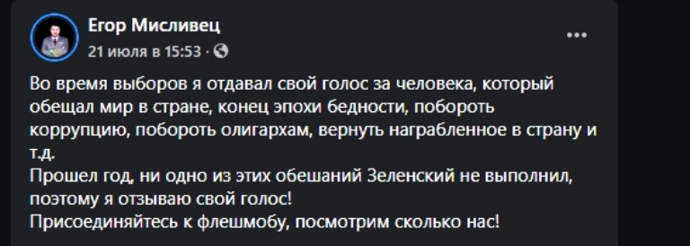 Украинцы призывают присоединяться к виртуальной акции, чтобы выяснить как много людей, отдавших свои голоса за бывшего шоумена, в нем разочаровались. Многие уже сегодня готовы признать, что поддержка Зеленского была ошибкой, которую нужно исправлять как можно быстрее, не дожидаясь 4 года до следующих выборов.