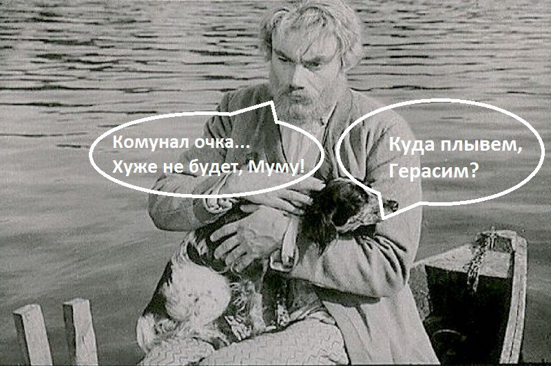 На третьем коллаже герой рассказа Ивана Тургенева "Му-му" Герасим говорит собаке, которую собирается утопить, что хуже, чем суммы в платежках за коммунальные услуги уже не будет.