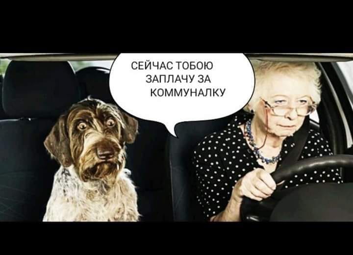 На еще одной фотожабе - кадр из фильма. Пожилая женщина собственноручно управляет авто, а рядом с ней сидит собака. Пенсионерка говорит, что сейчас рассчитается ею за коммунальные услуги.