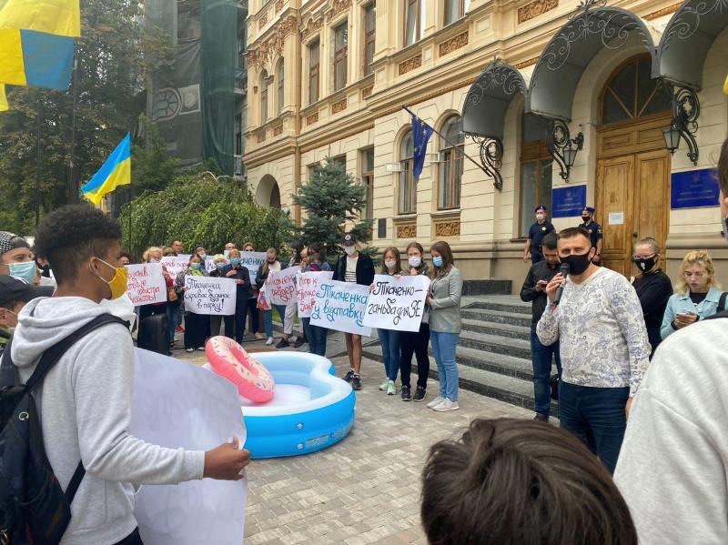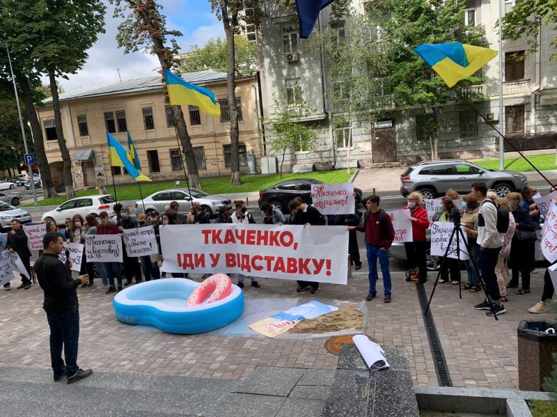 Активисты принесли в Минкультуры инсталляцию - пляж, подчеркнув остроту ситуации с домом Ткаченко на Трухановом острове. Несмотря на призывы митингующих, министр культуры не вышел для общения и продолжает игнорировать требования объяснить ситуацию со своей недвижимостью в заповедной зоне столицы, что вызывает возмущение у населения и требования снять его с должности.