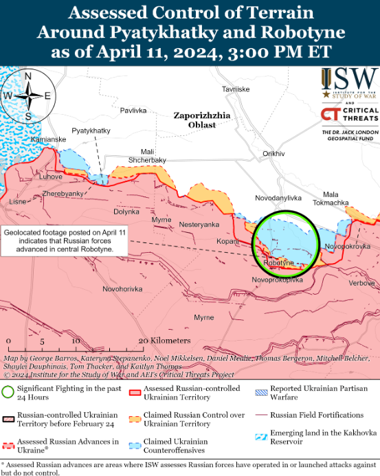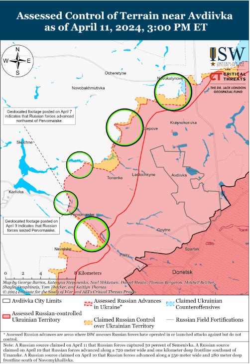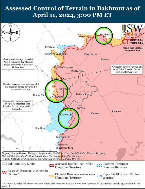 Специалисты ISW отмечают на сообщении, что 11 апреля российские войска продвинулись на юго-запад от Донецка, однако подтвержденных изменений на линии фронта не было. Российский милблогер утверждал, что российские войска продвинулись в пределах Новомихайловки (к юго-западу от Донецка), но ISW не нашло визуальных подтверждений.