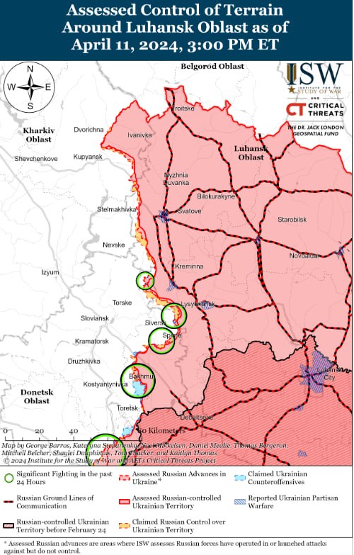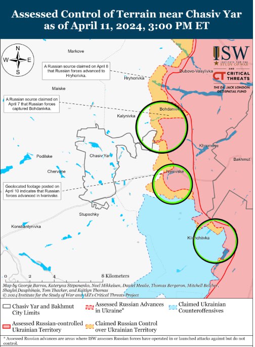 Российские войска недавно подтвердили наступление в направлении Часов Яр на фоне непрерывных позиционных боев за 11 апреля. Геолокационные кадры также указывают на то, что российские войска продвинулись к западу от Ивановского (к востоку от Часов Яра). Позиционные бои продолжались вблизи Часового Яра, Ивановского и Клещеевки.