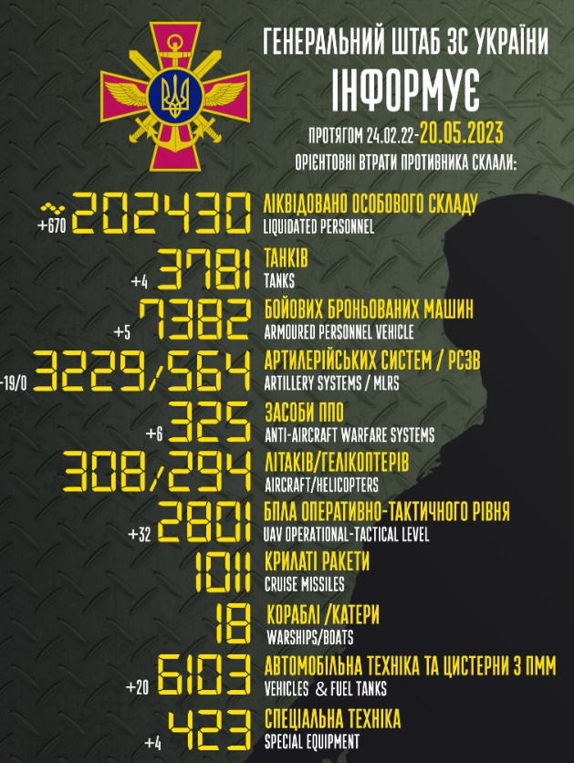 Общие потери российской армии в Украине с 24 февраля 2022 по 20 мая 2023 года ориентировочно составили: