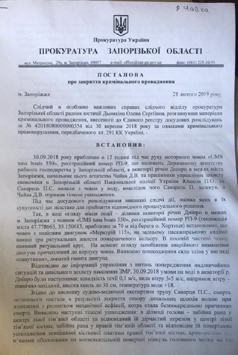 Речь идет о трагедии на воде в Запорожской области, которая произошла в 2018, когда в результате падения с катера тогда еще руководитель Запорожского рыбоохранного патруля Дмитрий Чайка попал в реанимацию с множественными травмами, а сотрудник управления защиты экономики погиб. После этого в СМИ пытались сделать виновным Чайку, но есть постановление Запорожской прокуратуры 2019 года, в котором сказано о закрытии уголовного дела по причине отсутствия состава преступления.