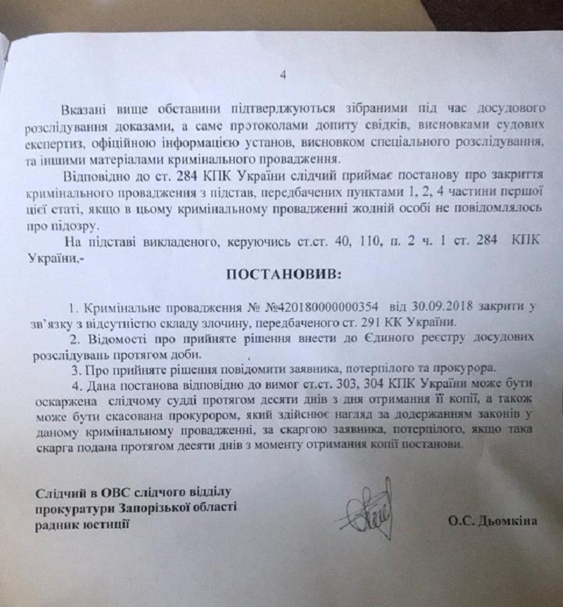 "Уголовное же производство в отношении этого факта было закрыто в связи с отсутствием состава преступления прокуратурой Запорожской области. В постановлении о закрытии уголовного производства говорится, что никаких следов алкоголя или сильнодействующих лекарственных средств обнаружено не было. Я предоставляю вам это постановление, пусть люди видят", - добавил он.