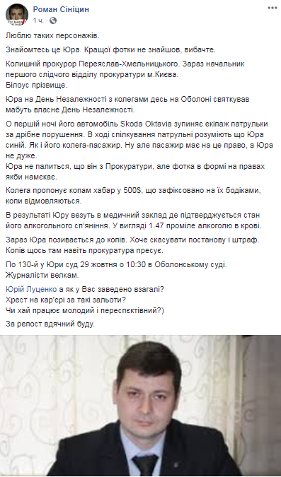 "В час ночи его автомобиль Skoda Oktavia останавливает экипаж патрульки за мелкое нарушение. В ходе общения патрульные понимают что Юра синий. Как и его коллега-пассажир. Ну если пассажир имеет на это право, а Юра не очень. Юра не палится, что он из Прокуратуры, но фотка в форме на правах, как бы намекает. Коллега предлагает копам взятку в 500$, что зафиксировано на их бодиками, копы отказываются. В результате Юру везут в медицинское учреждение где подтверждается состояние его алкогольного опьянения. В виде 1.47 промилле алкоголя в крови", - пишет активист.