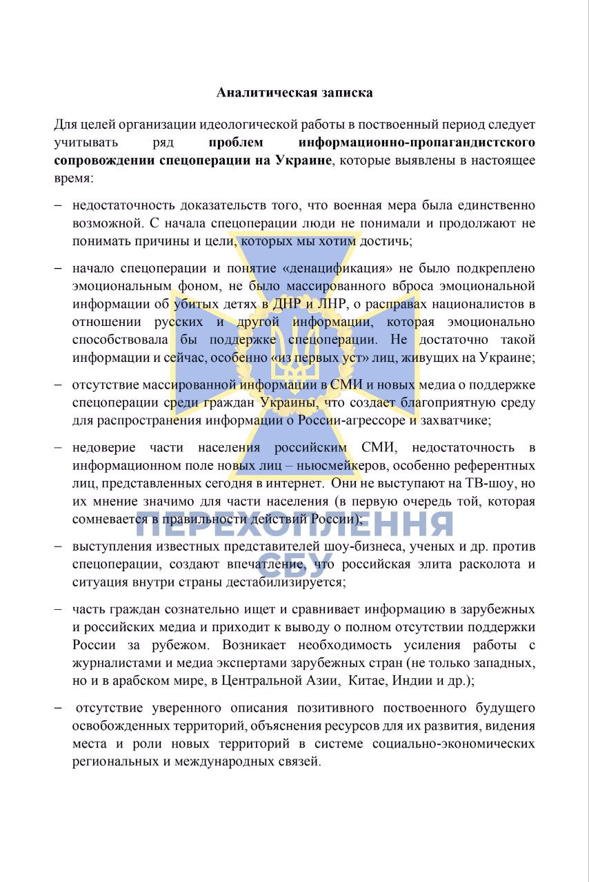 Служба безопасности Украины получила доступ к пропагандистским методикам, созданным российскими спецслужбами, о "правильном освещении спецоперации" в Украине. Однако сотрудники ФСБ РФ признают, что их план провалился и теперь пытаются найти новые оправдания полномасштабной войны и военных преступлений российских оккупантов.