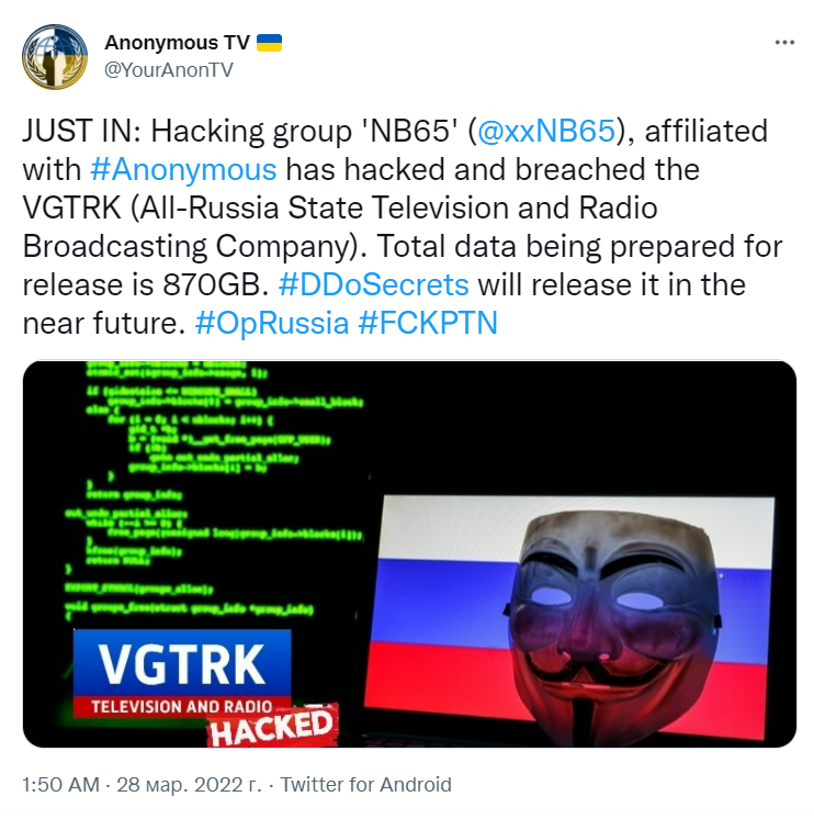 Международная группа хакеров Anonymous продолжает вести кибервойну против России в поддержку Украины. В этот раз кибербойцы взломали ВГТРК (Всероссийскую государственную телевизионную и радиовещательную компанию).