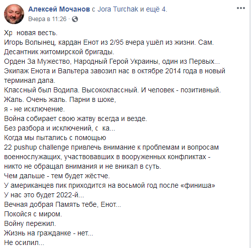 Как написал украинский автогонщик Алексей Мочанов, Волынец смог пережить войну, а жизнь на гражданке не выдержал. Также он напомнил, что всем воинам после участия в военных действиях требуется психологическая помощь.