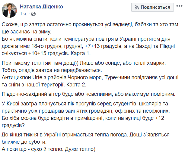 "Похоже, что завтра окончательно проснуться все медведи, сурки и кто там еще засыпает на зиму. Потому что как можно спать, когда температура воздуха в Украине на протяжении дня достигает +7 +13 градусов, а на Западе и Юге ожидается +10 +15 градусов", – пишет синоптик.