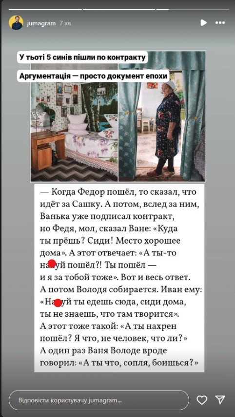 "У тети 5 сыновей пошли по контракту. Аргументация - просто документ эпохи", - написал он в письме в своем Instagram.