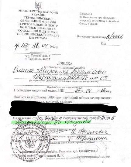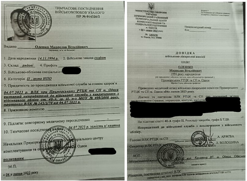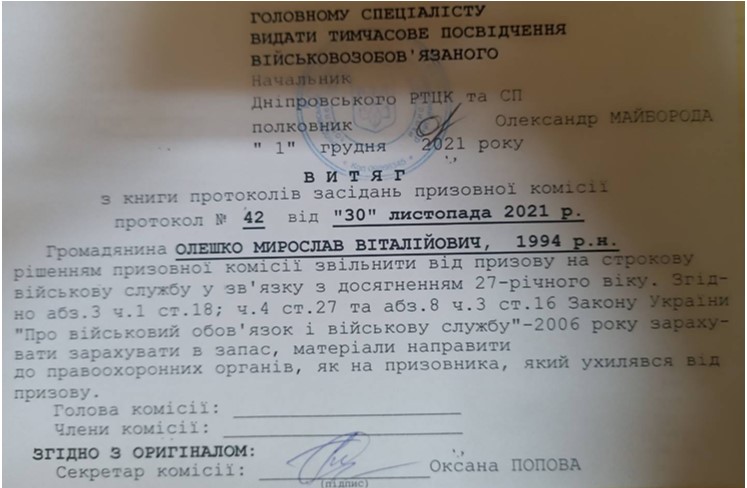 Согласно имеющимся в редакции материалов, в апреле 2022 Олешко даже прошел медосмотр в Тернопольском ОМТЦК и СП, а 27 апреля получил справку ВВК о пригодности к военной службе.